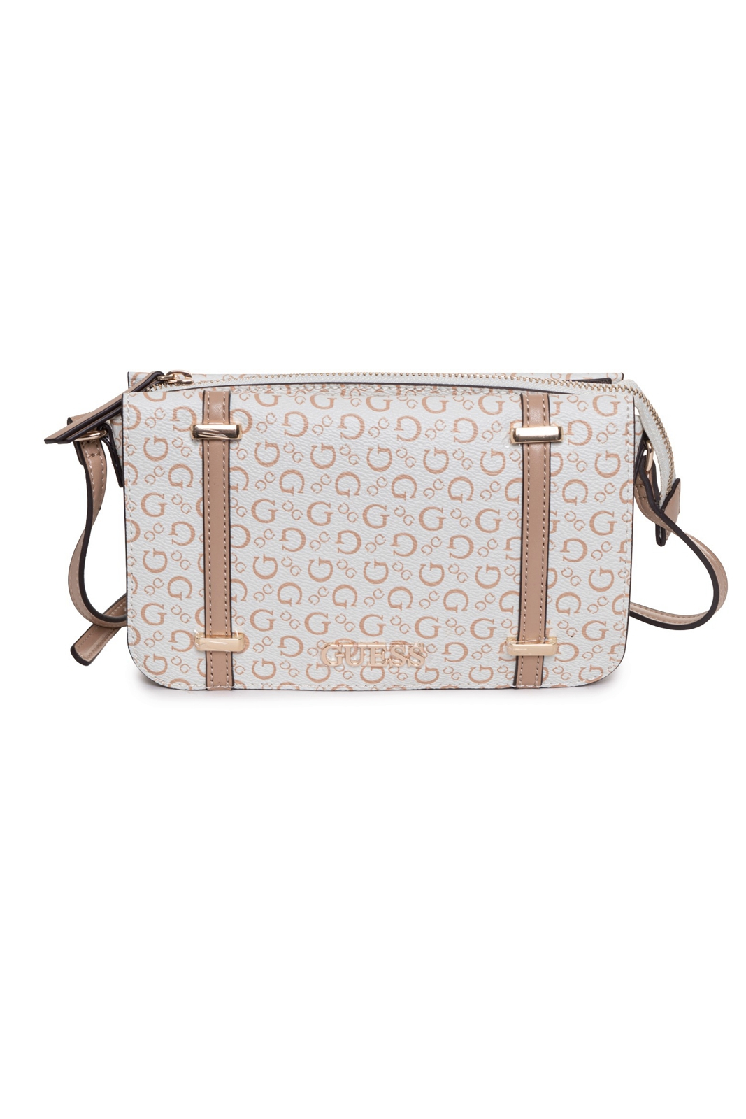 Modelul face parte din seria Guess Bethel, caracterizata prin silueta structurata si design compact tip crossbody bag. Exteriorul este realizat din poliuretan de calitate cu aspect de piele, material rezistent si usor de intretinut. Suprafata gentii este decorata cu model logo Guess si detalii metalice elegante, care subliniaza identitatea vizuala a brandului.