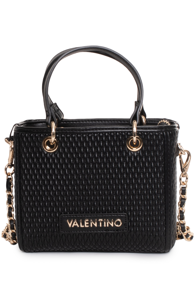 Modelul este prevăzut cu două mânere rigide, fixate prin elemente metalice, pentru purtare în mână, dar și cu o curea detașabilă tip lanț, care permite purtarea pe umăr sau crossbody. Logo-ul „VALENTINO” este aplicat frontal, completând designul minimalist.