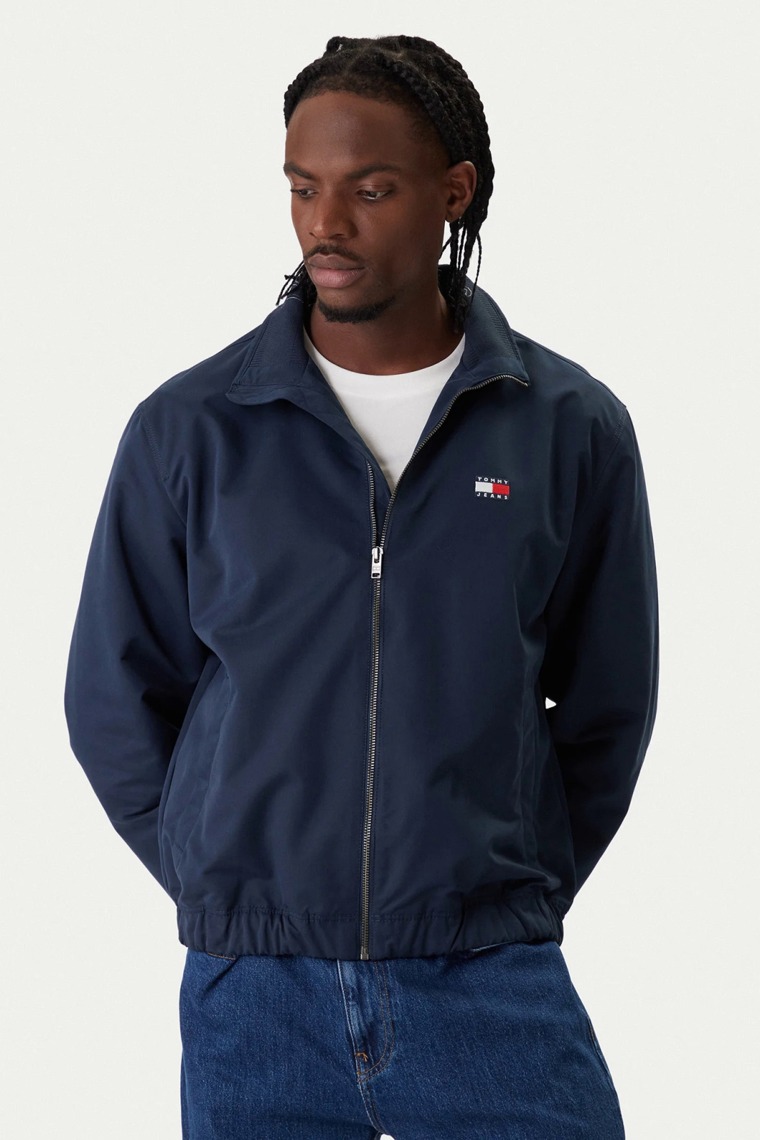 The model features a front zip closure, classic collar, and elastic waistband for a comfortable and adaptable fit. The iconic Tommy Jeans logo on the chest adds an authentic and easily recognizable touch.
