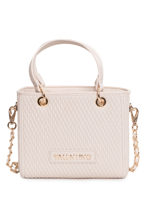 The model features two rigid top handles, attached with metal hardware for hand carry, as well as a detachable chain strap that allows shoulder or crossbody wear. The “VALENTINO” logo is applied on the front, completing the minimalist design.