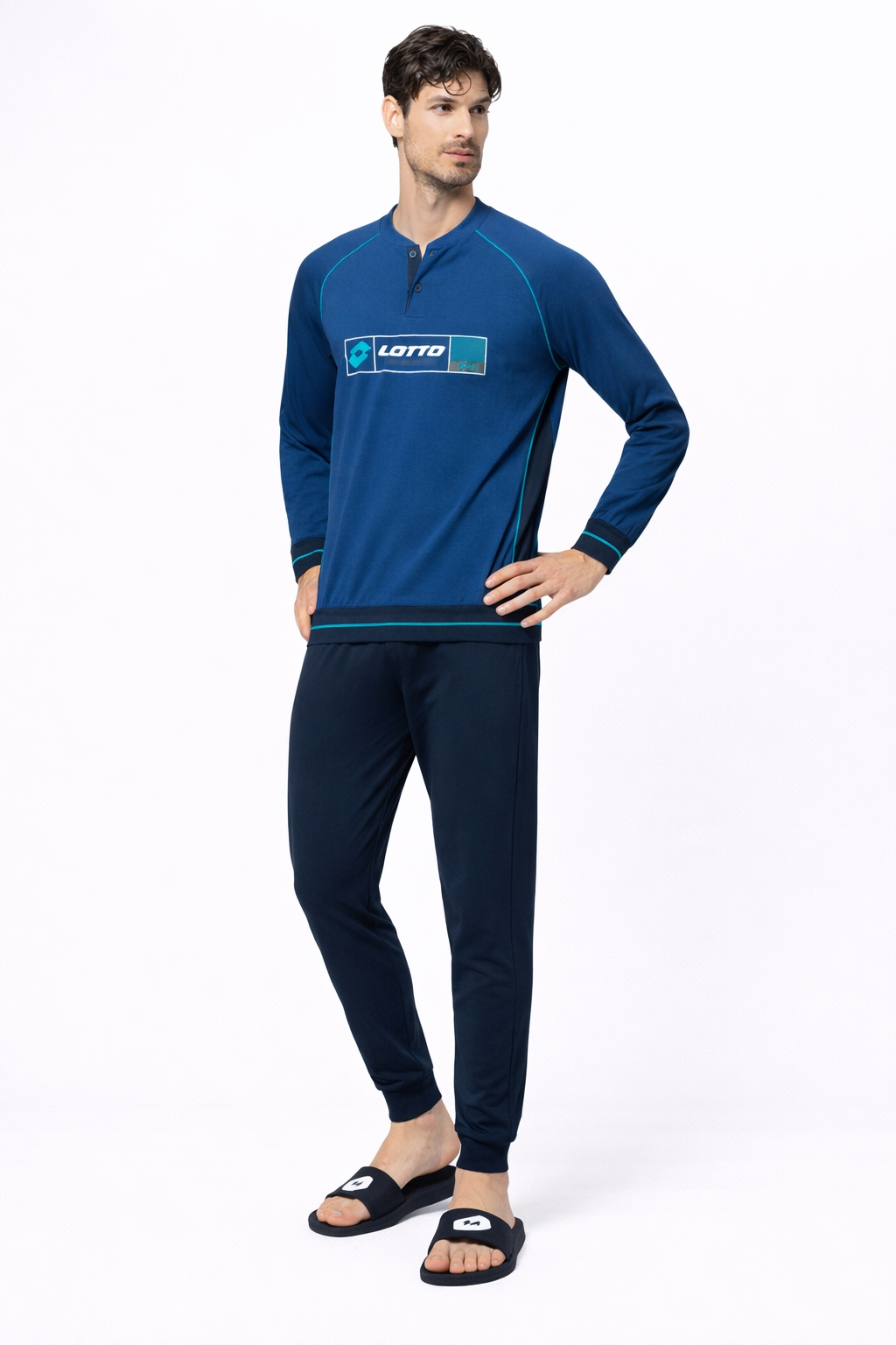 Lotto LP1225C men's pajamas, consisting of a long-sleeved shirt and long pants. Made from comfortable, soft-touch fabric, ideal for sleeping or relaxing at home. The modern design with the Lotto logo gives it a sporty-casual look and makes it comfortable to wear for long periods of time.