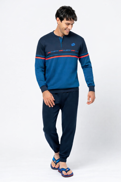 Lotto LP2127 men's pajamas, consisting of a long-sleeved shirt and long pants. Made from comfortable, soft-touch fabric, ideal for sleeping or relaxing at home. The modern design with the Lotto logo gives it a sporty-casual look and makes it comfortable to wear for long periods of time.