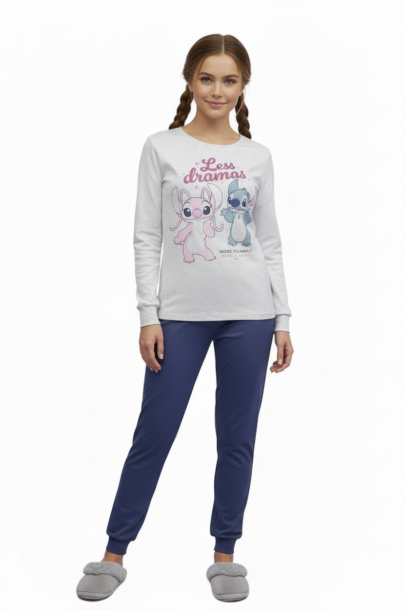 Pijamalele pentru adolescenti Disney Stitch DYD2707C sunt realizate din bumbac, material moale, respirabil si confortabil, ideal pentru pielea sensibila. Setul este compus din doua piese: bluza cu maneca lunga si pantaloni lungi, concepute pentru confort pe durata somnului si a momentelor de relaxare.