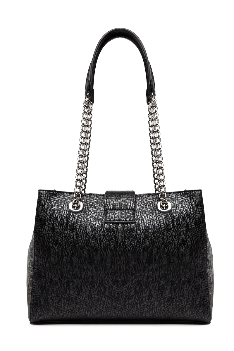Modelul este evidențiat de sistemul de închidere frontal decorativ, accentuat de un element metalic în formă de „V” și un detaliu tip lanț, care adaugă un plus de stil. Mânerele sunt realizate dintr-o combinație de material și lanț metalic, oferind un design distinct și elegant.