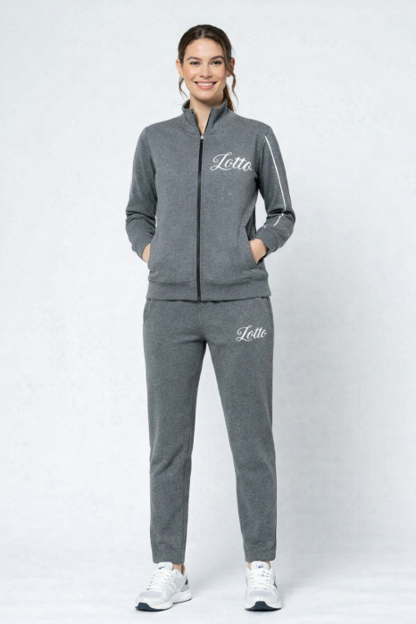 Bluza este prevazuta cu fermoar pe toata lungimea si guler inalt, oferind un plus de confort si protectie. Designul este completat de logo-ul Lotto aplicat si elemente grafice moderne, care adauga un aspect dinamic si actual. Pantalonii dispun de talie elastica pentru o potrivire confortabila si mansete la baza, asigurand stabilitate si un look sport-casual bine definit.