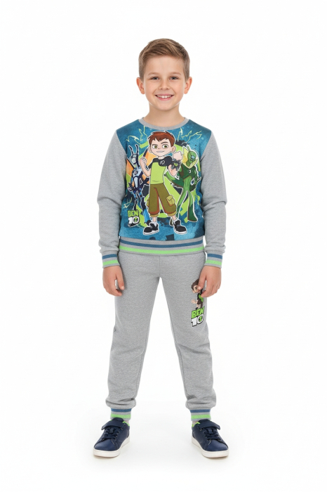 Trening ben 10 pentru baieti,compus din bluza de trening fara fermoar la care este atasat logo-ul Ben 10 si imprimare foto frontala. Pantalonul are 2 buzunare oblice, iar pe piciorul stang este imprimat logo-ul ben 10.