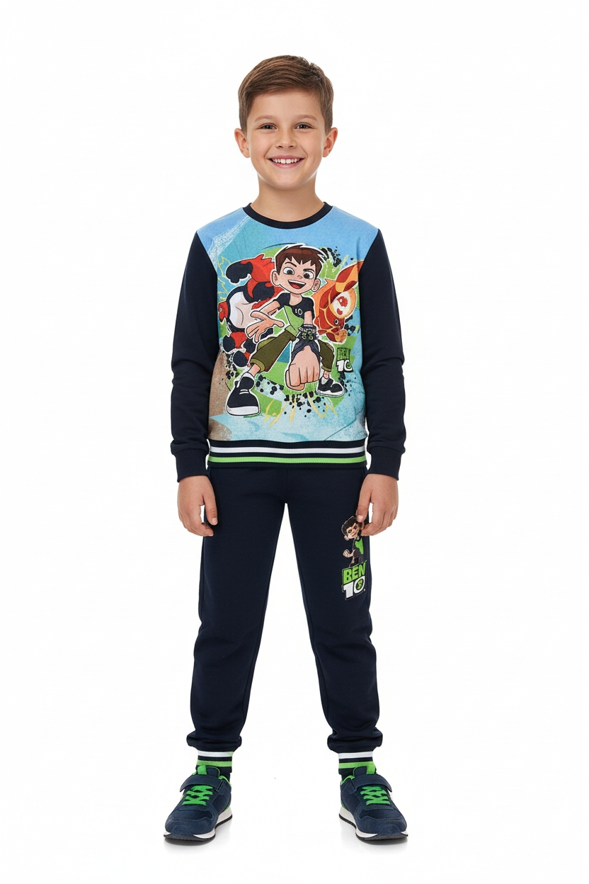 Trening ben 10 pentru baieti,compus din bluza de trening fara fermoar la care este atasat logo-ul Ben 10 si imprimare foto frontala. Pantalonul are 2 buzunare oblice, iar pe piciorul stang este imprimat logo-ul ben 10.